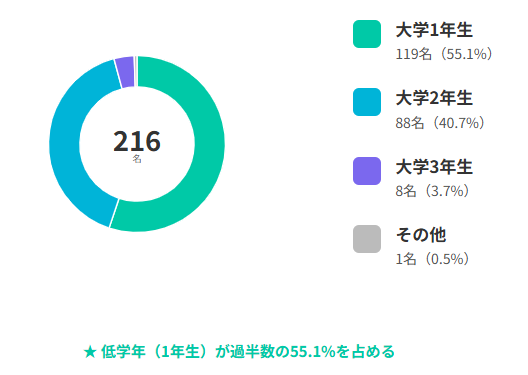 最多は大学1年生で全体の55.1%を占め、次いで2年生が40.7%。低学年(2年生以下)が過半数 を占めており、就職活動が本格化する前段階からキャリアを意識する学生の参加が際立ちました。